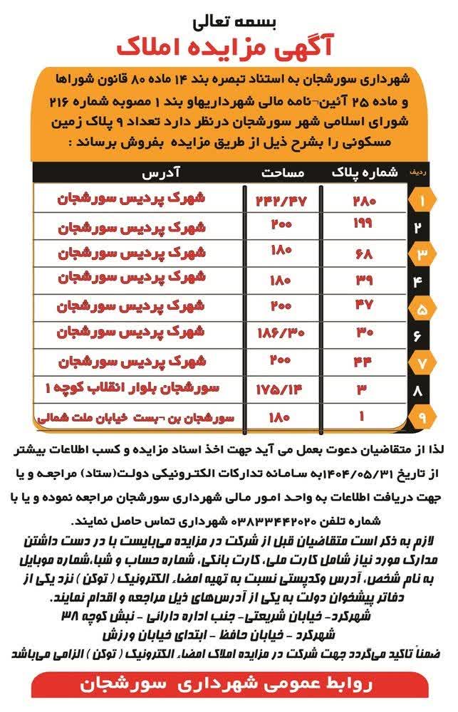 آگهی مزایده املاک شهرداری سورشجان